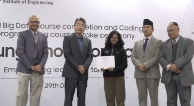 काठमाडाैं। सामसङ इनोभेसन क्याम्पस (एसआईसी)का विद्यार्थीलाई प्रमाणपत्र वितरण गरिएको छ। सामसङले जुन २७ देखि डिसेम्बर ३१, २०२५ का एआई, बीग डाटा सम्बन्धी कोडिङ र प्रोग्रामिङ कोर्स पूरा गरेका विद्यार्थीहरुलाई प्रमाणपत्र