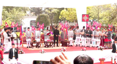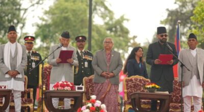 काठमाडाैं । नवनिर्वाचित मन्त्रीहरुले पद तथा गोपनीयताको शपथ ग्रहण लिएका छन् । राष्ट्रपति रामचन्द्र पौडेलले शुक्रबार शीतल निवासमा विशेष समाराेहकाबीच नवनियुक्त मन्त्रीहरुको शपथ ग्रहण गराउनुभएकाे हाे । नयाँ मन्त्रीपरिषदमा प्रधानमन्त्री
