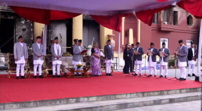 काठमाडौं । नवनियुक्त ४ जना मन्त्रीहरूले पद तथा गोपनीयताको शपथ ग्रहण लिएका छन् । राष्ट्रपति कार्यालय शीतल निवासमा साेमबार दिउँसाे एक समाराेहकाबीच राष्ट्रपति रामचन्द्र पाैडेलले नवनियुक्त ४ जना मन्त्रीहरूलाई शपथ