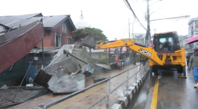 काठमाडौं । काठमाडौं महानगरपालिकाले थापाथलीको कालमोचनस्थित राममन्दिर परिसरमा बनेका व्यवसायिक टहराहरू भत्काएको छ। महानगरपालिकाले शुक्रबार उक्त क्षेत्रमा बनेका टहराहरू डोजर चलाएर हटाएको हो । यी संरचनाहरु गुठी संस्थानको जग्गा हड्पेर