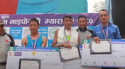 काठमाडौं । नेपाली सेनाको त्रिभुवन आर्मी क्लबका हुमलाल श्रेष्ठले इलाम-माइपोखरी म्याराथुन जितेका छन् । ४२. २ किलोमिटर दुरी उनले २ घण्टा ५८ मिनेट १६ सेकेन्डमा पार गरी अरू सहभागीलाई पछि