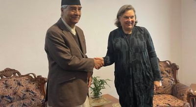 काठमाडाैं । नेपाली कांग्रेसका सभापति शेरबहादुर देउवासँग संयुक्त राज्य अमेरिकाका राजनीतिक मामिलासम्बन्धी उपविदेशमन्त्री भिक्टोरिया नुल्यान्डले आज शिष्टाचार भेटवार्ता गर्नुभएको छ । भेटमा द्विपक्षीय सम्बन्ध, लोकतन्त्र, विकास र सुशासनमा प्राप्त सहयोग