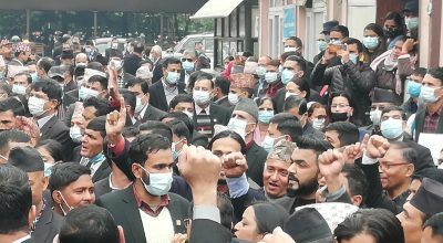 काठमाडौं । नेपाल बार एशोसियसनमा आवद्ध कानुन व्यावसायीहरुले आज पनि प्रधानन्यायाधीश चोलेन्द्र शमशेर राणाको राजीनामा माग्दै प्रदर्शन गरेका छन् । आज सुरक्षाकर्मीले सर्वोच्च परिसरमा प्रवेश गर्न नदिएकाले बारको परिसरमै उनीहरुले