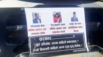 काठमाडौं । दोलखाको मुडे–चरिकोट खण्ड वर्षौदेखि अलपत्र परेपछि स्थानीय भौतिक योजनामन्त्री रेणुकुमारी यादव, सचिव रवीन्द्रनाथ श्रेष्ठ र सडक विभागका महानिर्देशक अर्जुनजंग थापाको तस्बिरसहितको फ्लेक्स सार्वजनिक सवारीसाधनमा टाँसेर विरोधमा उत्रिएका छन् ।