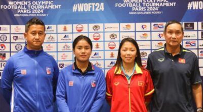 काठमाडौं । पेरिस ओलम्पिकका लागि महिला फुटबल छनोटको पहिलो खेलमा नेपाललाई भियतनामले हराएको छ । दशरथ रंगशालामा बुधबार बेलुकी सम्पन्न खेलमा नेपाल भियतनामसँग ५–१ ले पराजित भएको हो । भियतनामले पहिलो हाफमा ३ र दोस्रो हाफमा २ गोल गरेको थियो । नेपालका लमगि सावित्रा भण्डारीले एक गोल फर्काएकी थिइन् । खेलको ११ औं मिनेटमा फाम…