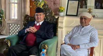 काठमाडौँ । नेपाली कम्युनिस्ट पार्टीका नेता झलनाथ खनालले पितृ शोकमा रहेका एमाले अध्यक्ष केपी शर्मा ओलीलाई भेटेका छन् ।पूर्व प्रधानमन्त्री समेत रहेका खनाल सोमबार ओली निवास गुण्डु पुगेर अध्यक्ष ओलीका