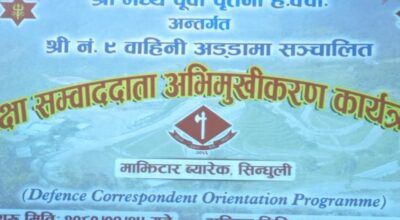 सिन्धुली । सिन्धुलीमा नेपाली सेनाले ११ जिल्लाका संचारकर्मीहरुका लागि अभिमुखीकरण कार्यक्रम संचालन गरिएको छ । नेपाली सेनाको मध्यपूर्वी पृतना हेडक्वाटर अन्तर्गत श्री नं ९ बाहिनी अड्डा सिन्धुलीको आयोजनामा याे कार्यक्रम