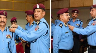 काठमाडौं । प्रहरी महानिरीक्षक धिरजप्रताप सिंहले बढुवा भएका ५ जना प्रहरी अतिरिक्त महानिरीक्षकलाइ दर्ज्यानी चिन्ह प्रदान गर्नुभएको हो । प्रहरी प्रधान कार्यालयमा बुधबार एक समारोहबीच प्रहरी महानिरीक्षक सिंहले बढुवा भएका