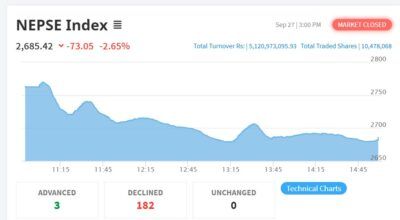 सेयर कारोबार मापक नेप्से परिसूचक ३२ दशमलव ५१ अंकले घटेर २ हजार ६ सय ३३ दशमलव ४२ अंकमा झरेको छ ।