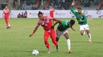 काठमाडौं, कात्तिक २८ । नेपालले अन्तर्राष्ट्रिय मैत्रीपूर्ण फुटबल खेलमा शुक्रबार बंगलादेशसित २–० गोलको हार व्यहोरेको छ । बंगलादेशको ढाकास्थित बंगबन्धु रंगशालामा भएको खेलमा घरेलु टोलीले दुवै हाफमा एक/एक गोल गरेको