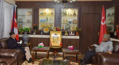 काठमाडौं । आन्तरिक विवाद चर्किएको बेला नेकपाका दुई अध्यक्षबीच खुमलटारमा डेढ घण्टा छलफल भएको छ । खुमलटारस्थित प्रचण्ड निवासमा दुई नेताबीच वार्ता चलिरहेकै बेला उपाध्यक्ष वामदेव गौतम पनि छलफलमा पुग्नुभएको