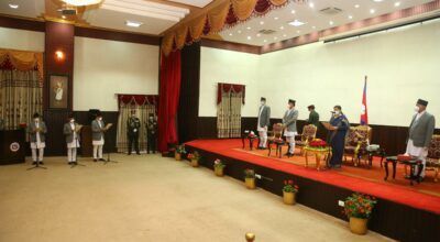 काठमाडौं । प्रधानमन्त्री केपी शर्मा ओलीको सिफारिसमा राष्ट्रपति विद्या देवी भण्डारीले नवनियुक्त तीन मन्त्रीहरुलाई पद तथा गोपनियताको शपथ ग्रहण गराउनुभएको छ । राष्ट्रपति निवास शितल निवासमा आयोजित कार्यक्रममा नवनियुक्त तीन